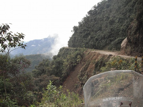と、思っていたらデス・ロード自転車ツアーの面々が降りを爆走しています。自転車を屋根に載せたツアーのバンも走っています。なのでまだデス・ロードの分岐点には来ていないということですね。彼らを追い越してしばらく走ります。