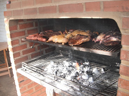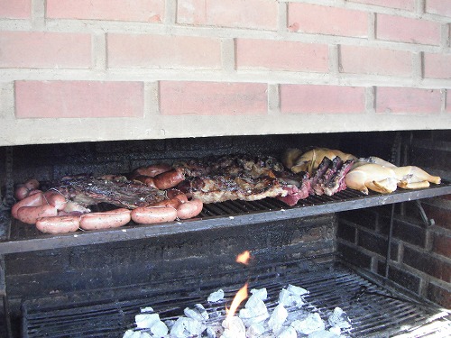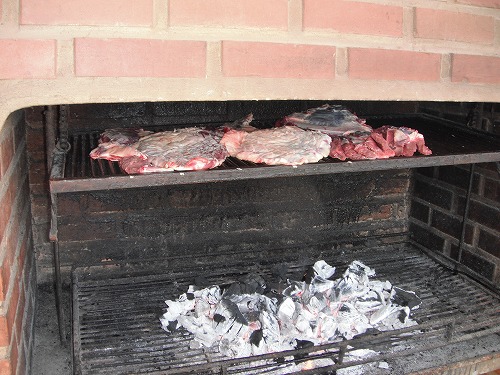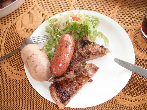 Here we had "Parrilia (Charcol griled meats)". They put fire on charcol and put meats and sausages on the grill. There was a huge ga between fire and the meats, so they can be cooked very slowly.