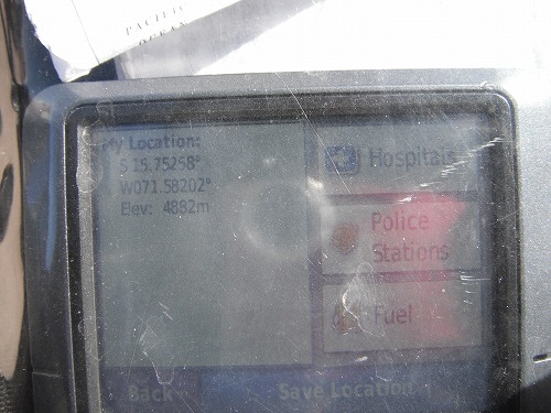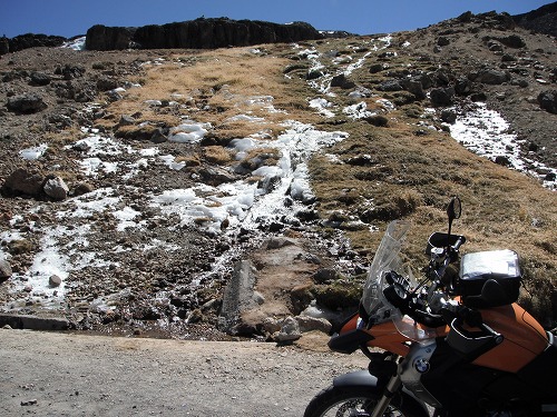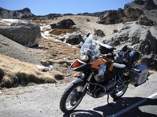 更に登って峠の最頂点へ。ここの標高は4,882m!! こりゃ凄いわ。観光バスとかも停まってます。周りには氷河を頂いた山々が見えます。ここが今まで一番標高が高いところになりますね。