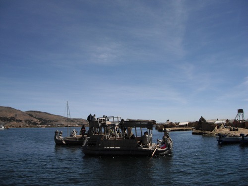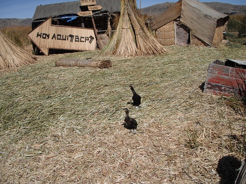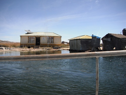 船はうわさに違えず遅い。湖にはペットボトルやビニール袋が浮いてたり、かなり汚染されている模様。船が進むに連れてウロス族の浮き島が見えてきました。