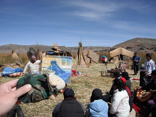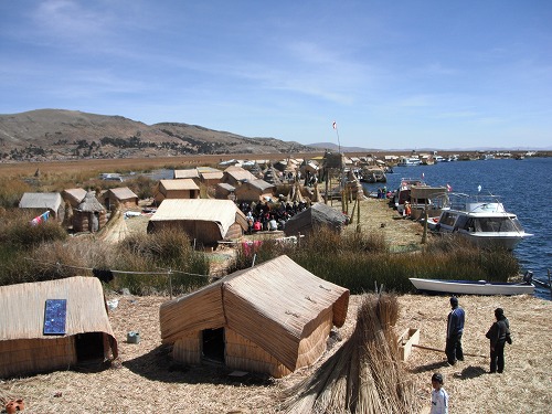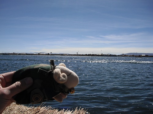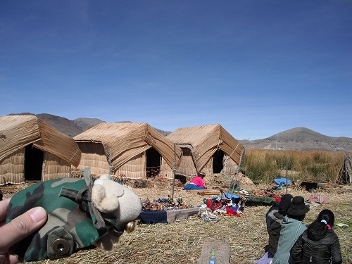 それからトトラ船に乗って対岸の浮き島へ。兄ちゃんとおばちゃんが一生懸命漕いでますが、逆に流されてます。仕方が無いのでモーターボートで押されて対岸へ。対岸には旅行者が山のように。対岸までの移動料5ソルとられました。