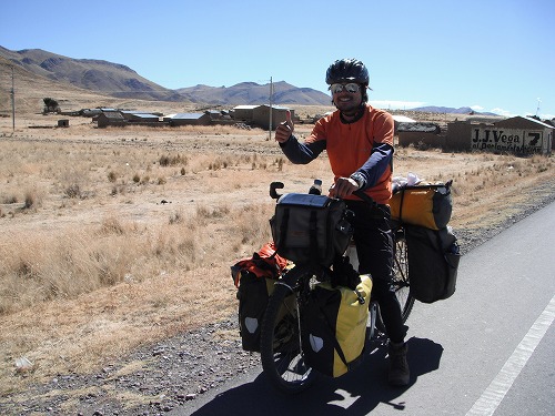 Cusco was at around 3,400m high and Juliaca was at 3,850 high, so there wasn'T much up and down. Around 20km before Juliaca, I saw a cyclist. It was Jose! I pulled over and greeted him.