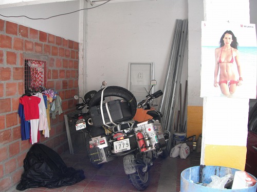 It started sprinkling just before Manizales, but not heavy enough to get wet. I went to a hostel "Pitt Stop" where Noah recommended but there was no garage for my GS. Then I went to "Aqui Me Quedo" where Claudia recommended, but the garage was in use... But the lady owner called her friend's hostel with a garage.