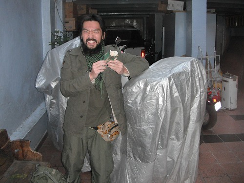 バックパック一個での移動なので身軽ですが、バスの中が寒いというので上着は多めに。パニア、ヘルメット、ジャケットは倉庫に保管。まあ、10日間くらいで帰ってきますが、愛車GSを抱擁。