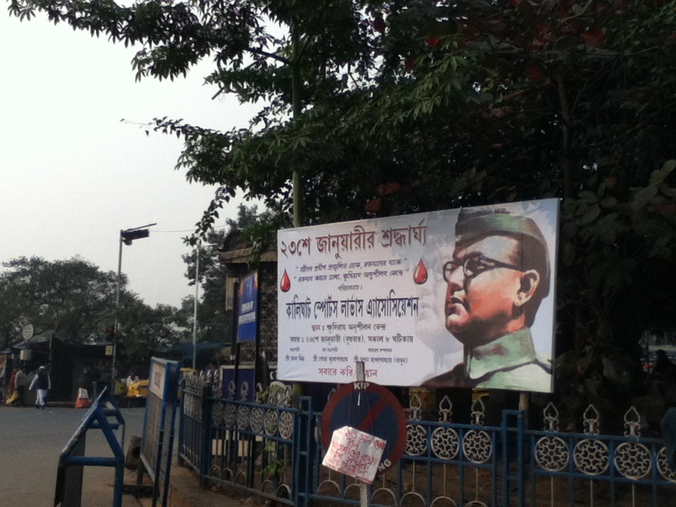 街中にはインド独立の志士チャンドラ・ボースの看板が。日本と共にインド支配していたイギリス軍と戦った武闘派の英雄。