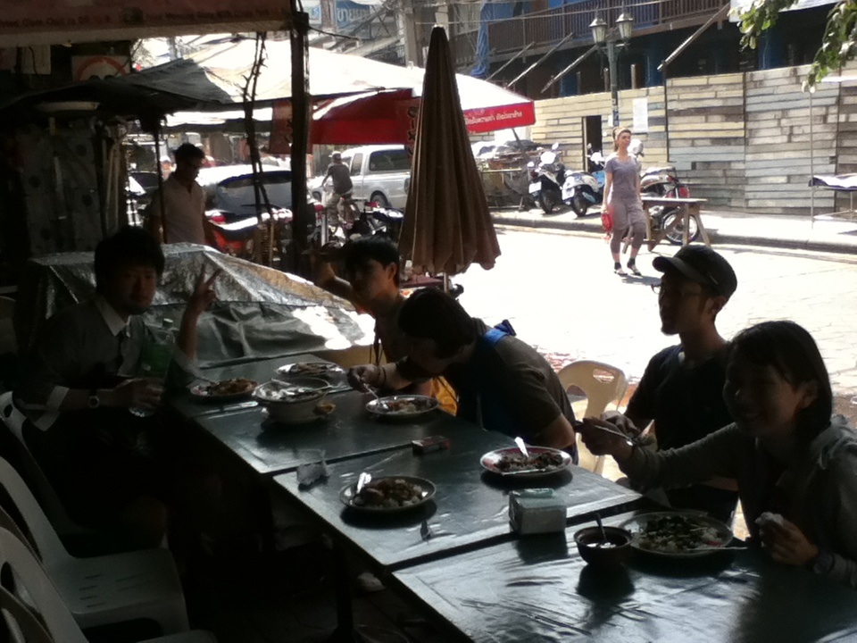 早速宿で知り合った旅人と早目の昼飯を屋台にて。ライスにおかずが2品で35〜45バーツとヤハリ安い。これは食べ過ぎに注意しないとな。