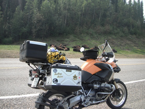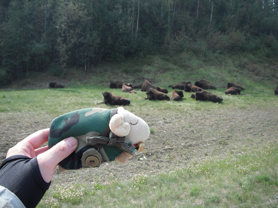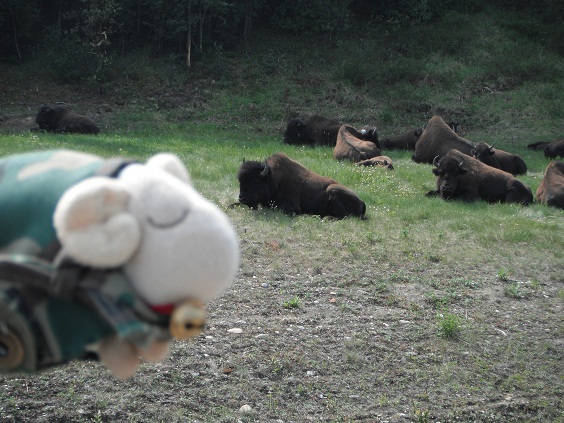 Toad Riverで給油とバッファローバーガーの昼飯をすませて、Coal Riverに向けて走ってると、なんとバイソン(バッファロー)の群れが!10頭以上はいるでしょうか、昼寝で路肩に寝っ転がっていました。モチロン写真を撮りました。ヒツジさんも大興奮です。