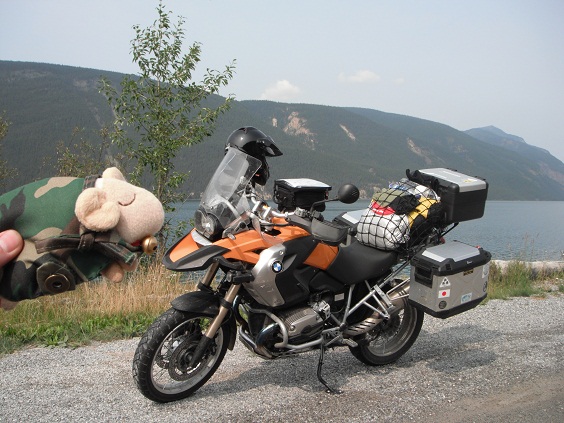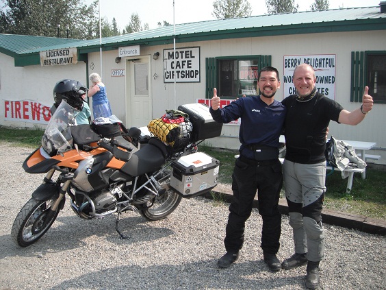 Coal Riverで給油を済ませ休んでいると、Moto Guzziに乗ったカップルが来ました。イタリア人のGianniと彼女です。アラスカの一番てっぺんのPrudhoe Bayからアルゼンチンの最南端Ushuaiaまで30,000kmの旅をしてるとのこと。この旅はスポンサーが付いていて、半分仕事なのだとか。羨ましい。また何処かで会えたらいいね、と再会を願って別々の道へ。あとここではアメリカ人のハーレー乗りのおっちゃん二人とも話こみました。ライダーはやっぱりいいですね。
