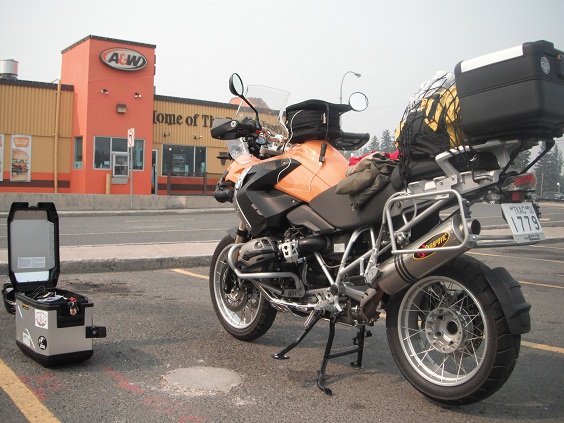 Clinton, 70 Mile Houseを過ぎ100 Mile Housrにて早めの昼飯。カナダのファーストフードチェーン、A&Wで食べました。パニアを降ろしてセンタースタンドを立てオイルのチェック。オイルは減ってないですね。