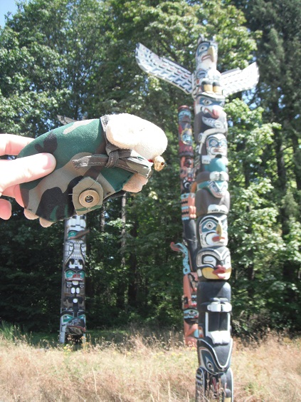 昼飯を食べたら今度はトーテム・ポールを見に。広場に7本のトーテムが建ててあります。よくテーマパークとかに偽物がありますけど、これは本物です。ワシはネイティブ・アメリカンのデザインが好きですね