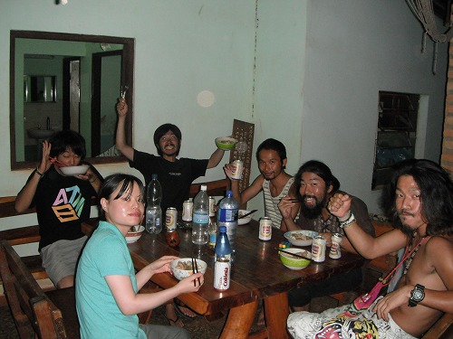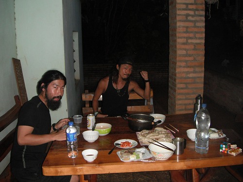 が、しかし、火力が弱いので、生姜焼き、というよりは生姜蒸し?ていう感じの調理法。がやがやとやっていたら新しい宿泊者トモヨちゃん登場。丁度生姜蒸しが出来上がったので、彼女も一緒にお昼ご飯。これが以外にイイ出来。