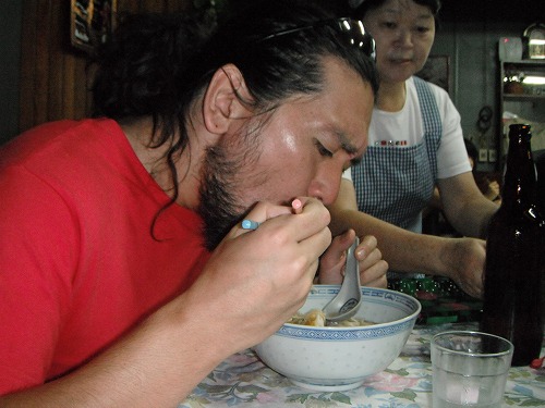 そして出来は?? うまーーい。アキさんが肉と葱の胡麻和えを作って来てくれました。これも絶品!! 楽しい夕食になりました。キミ君、凄い表情だよ。ウホっ。