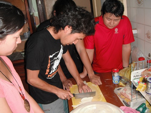 Back to the hostel, there were 2 more guests - Ikuko and Emi. So we had to make more noodle. As we found flour at the "Free" box, we made extra noodle.