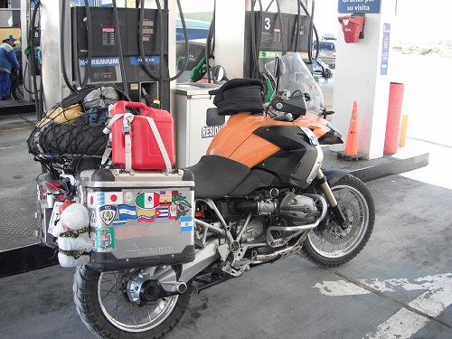 Viedmaという街で再び3号線は北進。また進行方向斜め左からの強風と闘います。100キロくらい走ったところに「YPF」があったので給油ストップをしたら、BMW R1200GS ADVに乗ったスイス人フランコが停まっていました。彼は1年半かけて世界一周をして、ブエノス・アイレスがゴール。日本にも来たそうで、日本の国旗とBMW HanedaとBMWジャパンのステッカーが張ってあります。日本にいた時には日本人に助けてもらった、とのことでジュースをおごってもらいました。ありがとう。