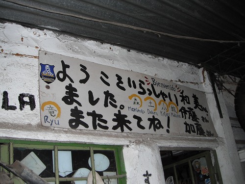 We arrived Azul around 3pm. It took a while to find "La Posada" but we got there. On the outside wall there were lots of writings. Some of them were in Japanese!! I put my "M-26-7" sticker and "Sanbariki (3 horse power)" sticker on the door.