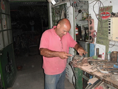 しかし、いつまで経ってもアサードが始まる気配がありません。9時半過ぎにようやくパリージャに火が入りました。食べ始めるのは11時過ぎになりますね。しかし楽しみです! ナイフを研ぐホルへさん。