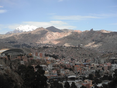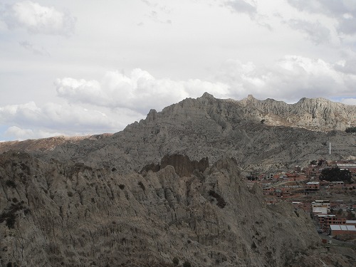 ふと、周りを見るとなかなかの風景。雪山を背景にすり鉢上の盆地に広がるラパスの市外。そして右手には荒々しい崖が露出する丘とかがあり、「凄いな、ラパス」と思わず言ってしまう風景です。