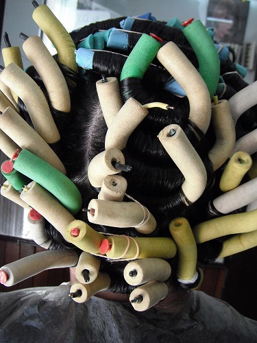ケンちゃんは1時45分の飛行機に乗らなければならないので、先に。カールを巻き終わってパーマ液をかけて、今度はワシの番。これがボリパーをかける前。