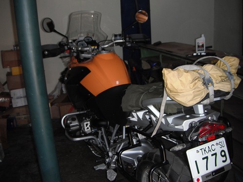 I took my GS to "Motoservi" from the morning. I took off the silencer, the mad guard, and then the shock absorber. I put the bike cover and I was ready for Chile.