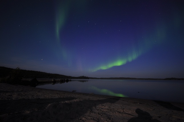 12時前にキャンプ場のオバちゃんがオススメのPrelude Lake(プレリュードレイク)まで出発。30キロくらい離れてます。街の明かりが無い方がヤッパリ見えやすい、と。そしたら既にオーロラ始まってます!今日のは凄い!!空から降って来るようです。何回か車を停めて見ましたが、プレリュードまで急ぎます。