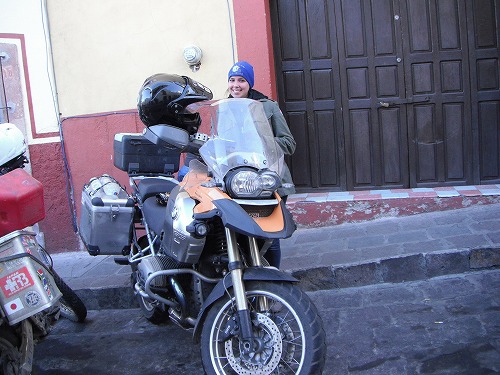 さてグアナファトに付きましたが、思った通りに迷路です。目的のホテルにGPS上では限りなく近いのですが、一方通行だらけで近づけません。バイクを停めるのにも一苦労。 ようやくバイクを停めて徒歩でホステルへ。ブライアンなちとは離れ離れになってしまいました。歩きでも迷いに迷って到着。カーラがいなければどんなに苦労したことか。ブライアンたちは既に到着していて、ホテルにバイクを停めに行ったとか。