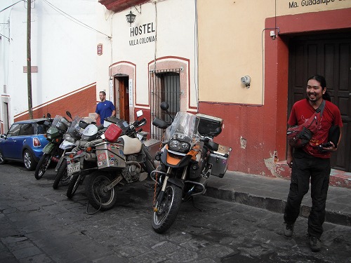 ようやく到着しましたが、バイクを停める場所がないので従業員の車をどかしてもらいました。ブライアンと仲間たちの3台がすでに停まっているのでバイクが5台になりました!バイク小道って感じですね。 ここで日本人のシゲ2号(El Chino)とナオに出会いました。彼らはバックパック旅行をしてます。しばらくしてからブライアンも戻って来て久しぶりの再会をしました。元気そうで何より!スペイン語のレッスンを受けていましたが、相変わらずダメだそうです!今はアメリカ人のスティーブンとアメリカ人カップルの3台で旅をしてるそうです。楽しそうだな。