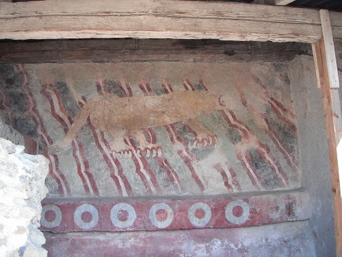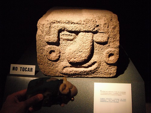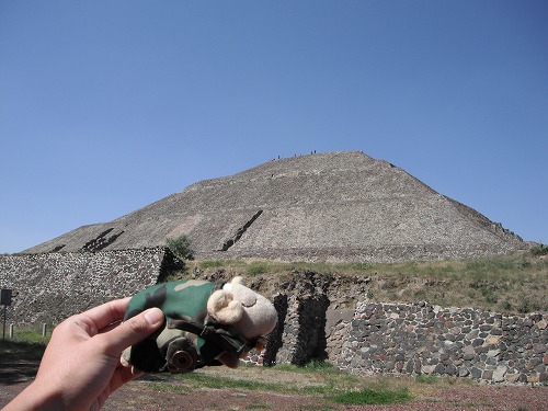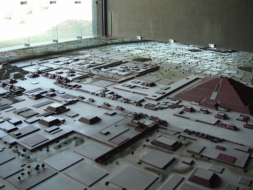 それから博物館で出土品を見て回りました。 それから太陽のピラミッドへ。バートレスが修復してかなりメチャクチャになったとは聞いていましたが、うーん、なんか修復がコンクリートで固めただけ?で雰囲気ぶち壊しです。一応一番上まで登りました。空気が薄いせいか登りで息が切れます。見晴らしは最高!でも、コンクリートが目について悲しい気持ちになってしまいます。