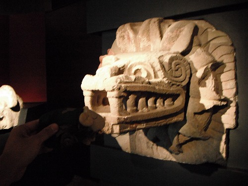 テオティワカンへのバスは35ペソ、1時間くらいで到着。 とうとう憧れのテオティワカンにやった来ました!日差しがキツイですね。最初はケツアルコアトルの神殿から攻めてしました。興奮しながら階段を上がって行きます。あ、あれがケツアルコアトル(羽の生えた蛇)の頭ですね。ようやくこの目で見る事が出来ました。ナオは「テオティワカンを全力疾走!」というムービーを作ろうと全力疾走してましたが、空気が薄いせいか、途中で頭痛と吐き気がしてへたれて止めてしまいました。