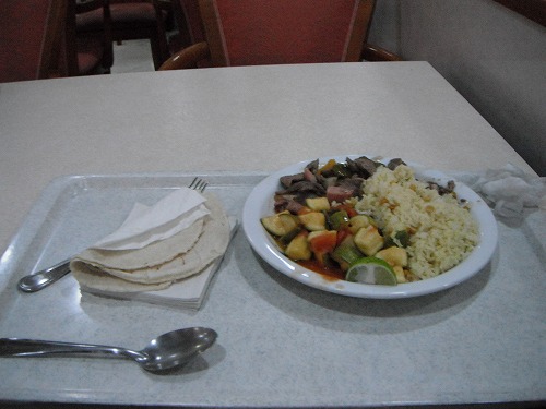 11時過ぎに到着し、昼メシを食べようと安そうな店を探しますが流石リゾート地、ありません。しかも路駐ができません。こりゃまいった。しばらくグルグルし、ようやく一軒のメシ屋に廻りあいました。セットメニューとドリンク付きでで60ペソ。牛タンの煮込みを味見させてくれて、美味かったのでそれにしました。ここは悪く無いです。