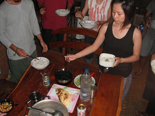 In the afternoon, 5 more guests arrived. Now we have 14 guests. It's almost full house. But we faced a huge problem. None of shops opens in sunday afternoon. We had no much foods for dinner. What we had were - 5kg of rice, 1 avocado, 9 eggs, 1 onion, 1 cabegge, some garlic, seaweed and some seasoning. With these ingredients we had make dinner for 14!