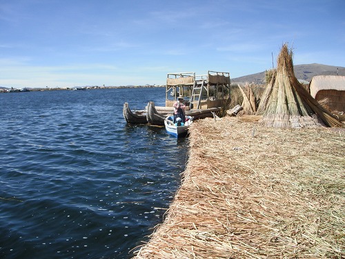 船はうわさに違えず遅い。湖にはペットボトルやビニール袋が浮いてたり、かなり汚染されている模様。船が進むに連れてウロス族の浮き島が見えてきました。